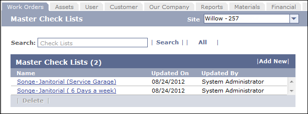 - All of the check lists associated with the selected site plus all global check lists appear in a Master Check Lists table on the screen. Show me